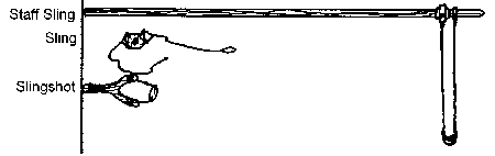One of the most common missile weapons is the humble sling. This weapon can hurl small stones or lead bullets with lethal force. The sling is a simple length of cord or cloth with a cup in the center. The projectile is placed in the cup, and the sling is whirled rapidly in a sidearm or overhead motion. Slingstones can be found in any rocky landscape. Normally, small round rocks are best, such as the type found in streambeds. Sling bullets are made of lead, bronze, or iron, much like the bullets for a firearm. The staff sling simply consists of a short wooden staff with a leather sling at one end. It can be used to throw larger and heavier projectiles than a normal sling, but can't throw them as far or as accurately. |